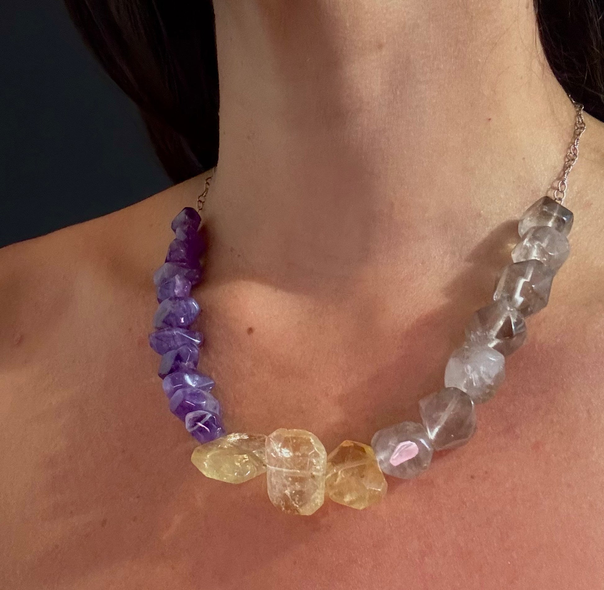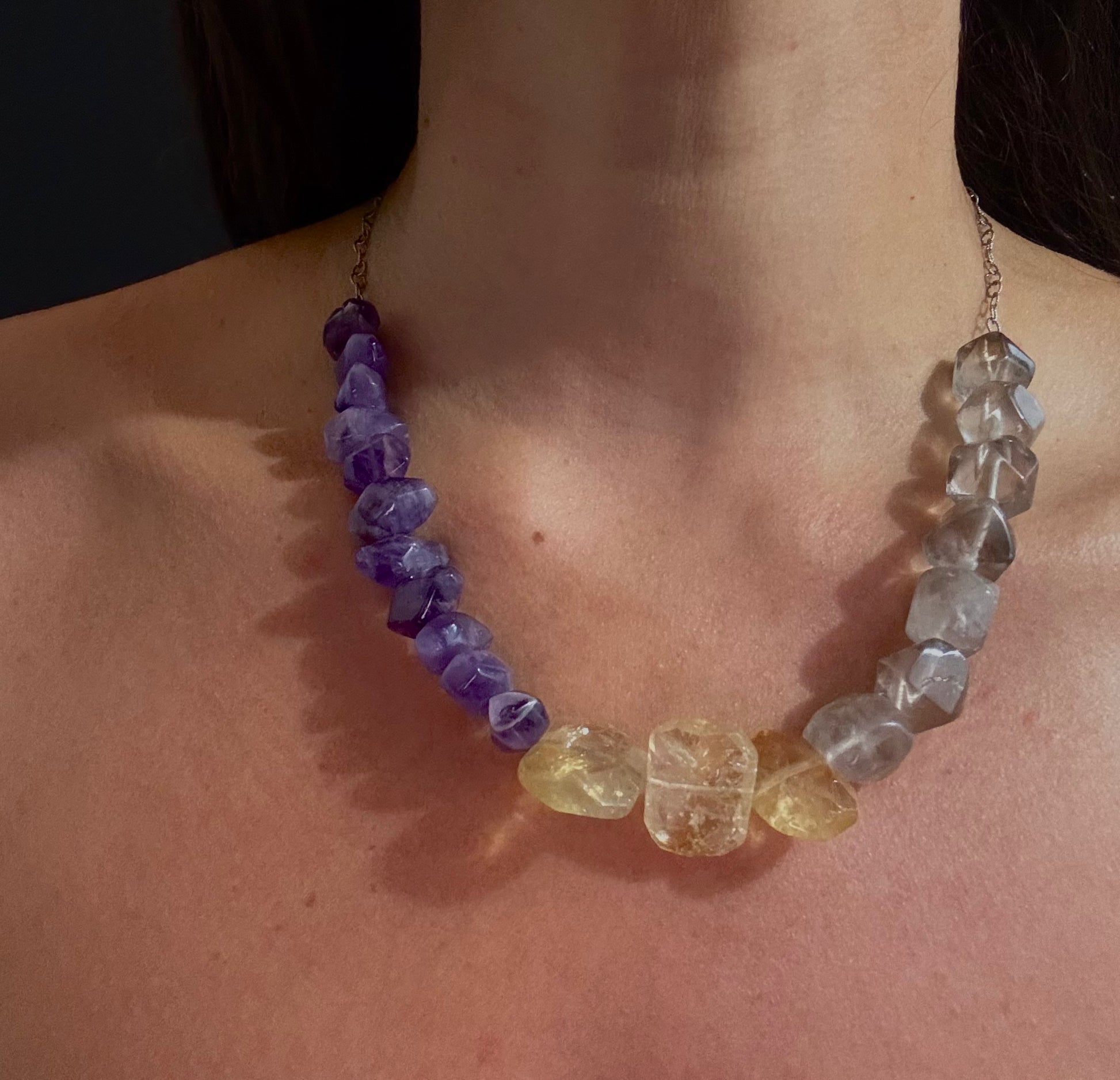 A fusion of amethyst, citrine, and smoky quartz to uplift, energize, and ground your spirit. This necklace supports your journey through transformation, clarity, and energetic protection.