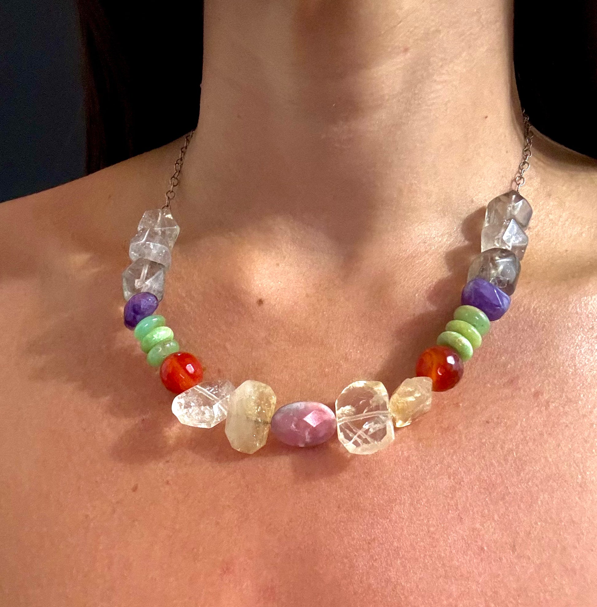 A powerful synergy of six stones: smoky quartz, amethyst, chrysoprase, carnelian, citrine, and pink opal. Protection, intuition, love, vitality, abundance, and emotional healing—woven into one piece. A talisman to balance body, mind, and soul.